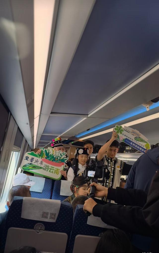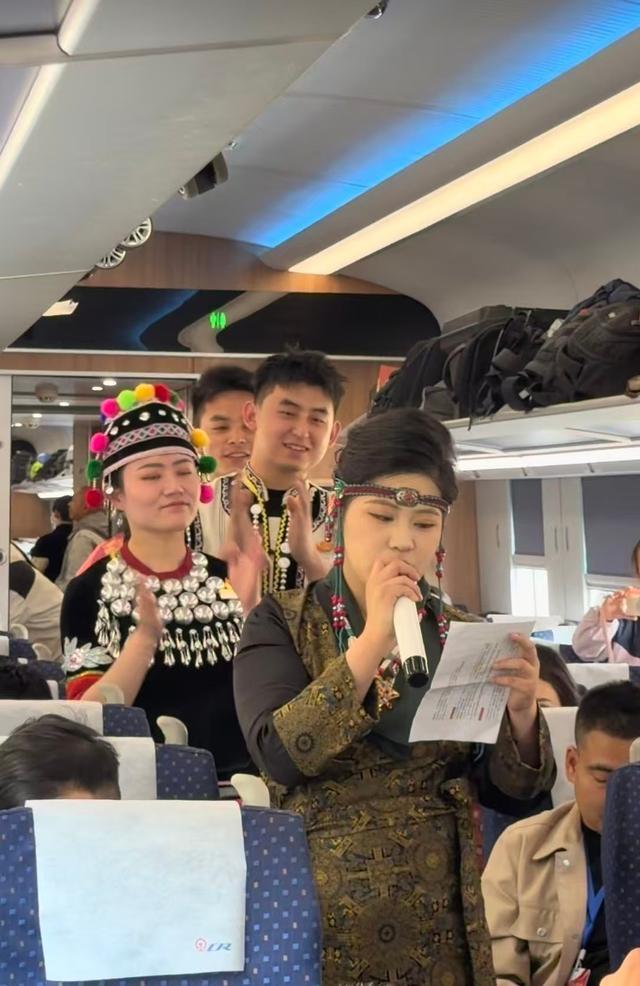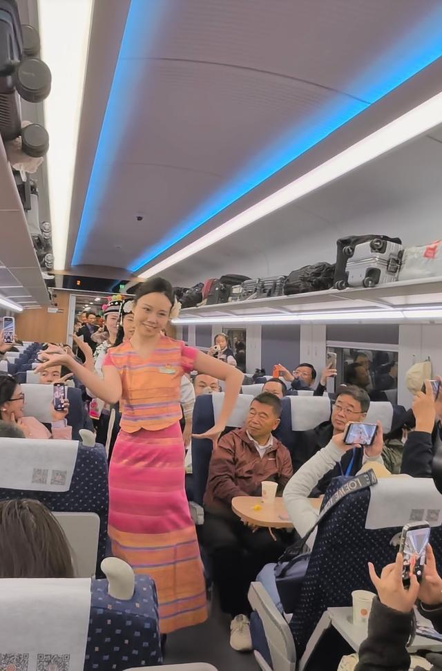 乘务员换上了民族服装,在车厢中间又唱又跳。彝族打跳、傣族舞、藏族舞按次献艺,音乐一响,总共车厢的氛围倏地拉满。