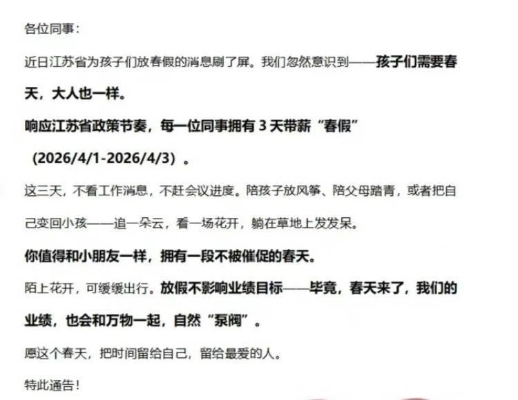 近日,江苏昆山一公司发布放三天带薪春假的示知激发网友温情。