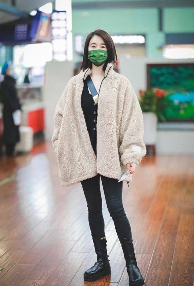 毛茸茸的羊羔绒外衣,御寒性极佳。若念念减轻肥胖感,可像左小青那样掀开一稔,内搭修身低领打底衫,显瘦又性感。借助小黑裤均衡外衣的推广感,营造出“上宽下窄”的视觉成果。
