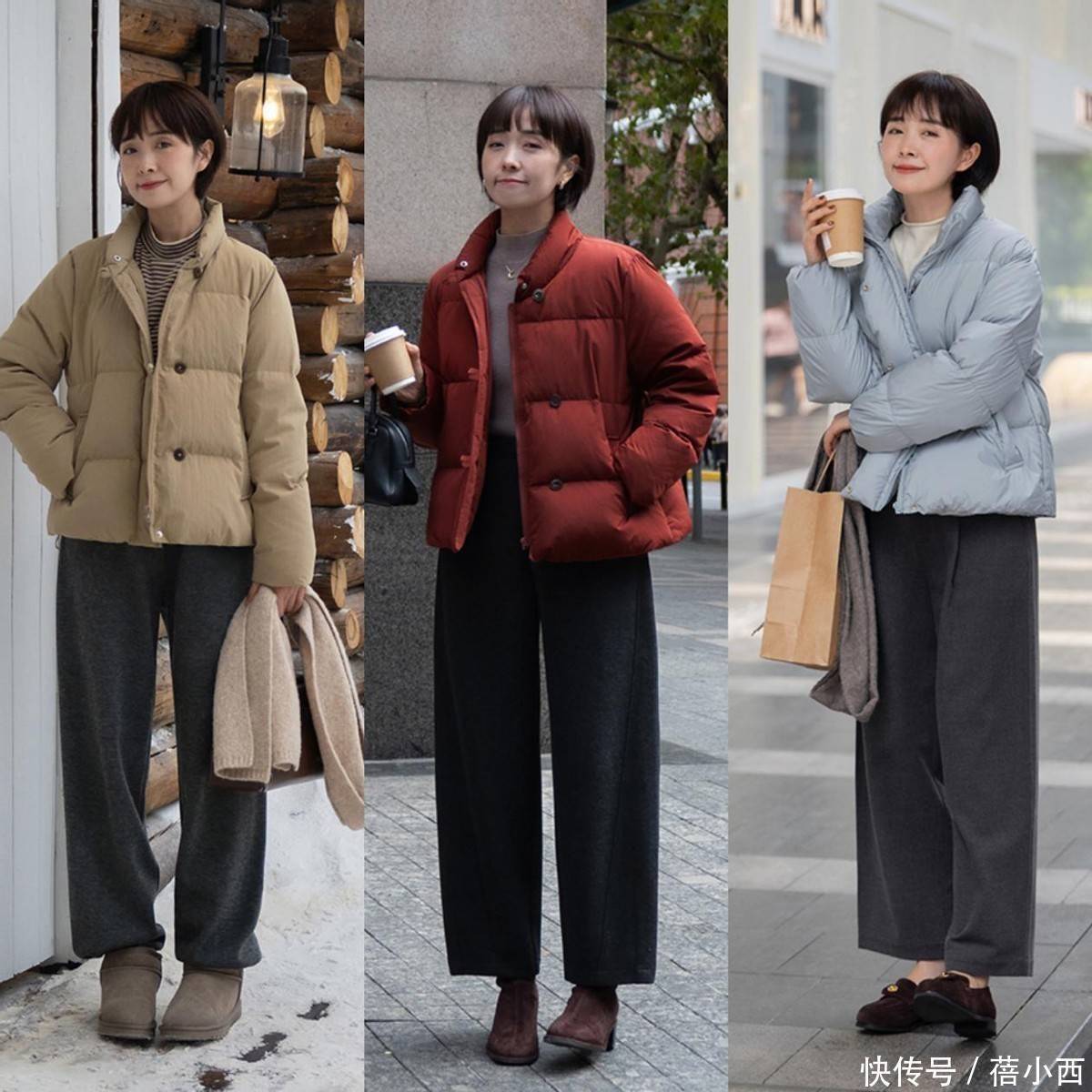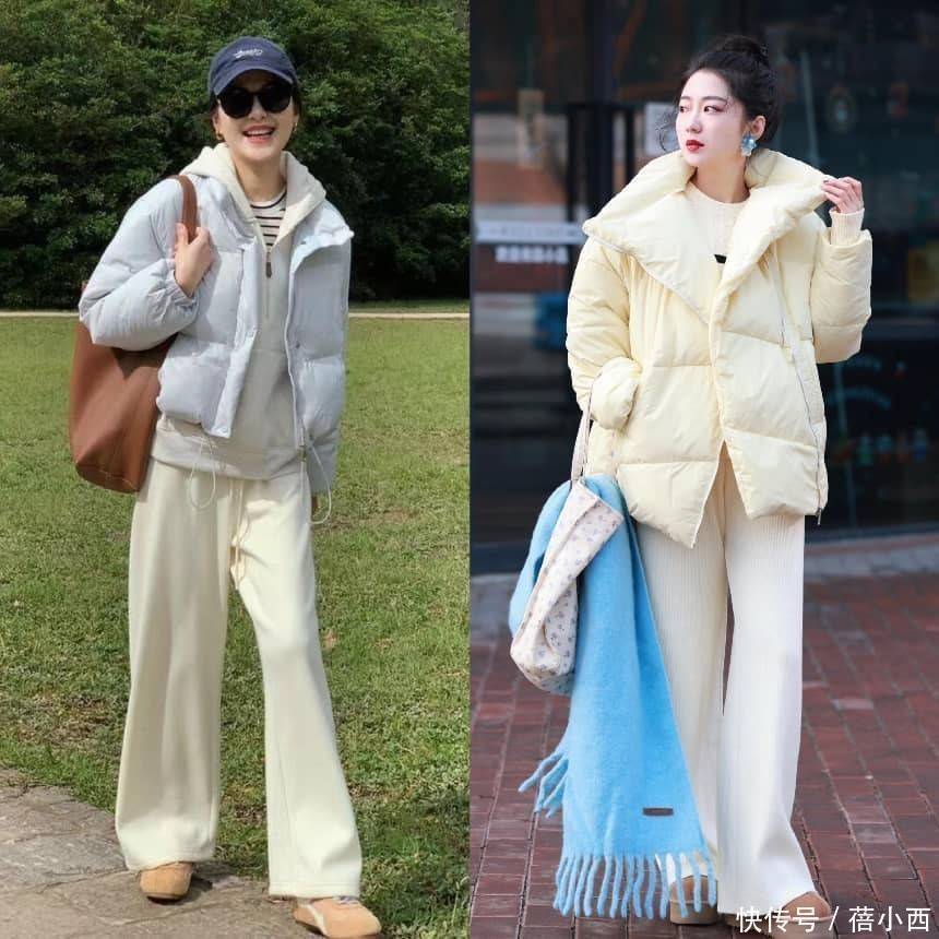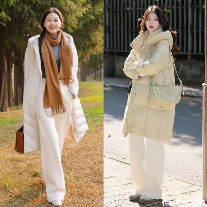 色调上,聘请米白色、奶白色等偏平和的白色系,比纯白更显暖热,也更适配教育女性的气质,还能幸免显突兀,上半身搭配淡色的羽绒服,非常减龄。